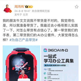 【周鸿祎宣布准备带货了】这两天,周鸿祎在社媒上发文称,“我的朋友牛文文说我不带货是不对的,我觉得也是,所以我准备带货了。我最近去小杨哥那儿实践了一下,对怎么带货有点信心了。第一带货我们的手表、第二带货我们的AI办公套件,大家觉得怎么样?”。